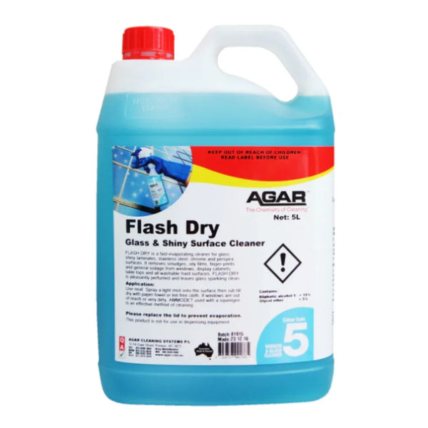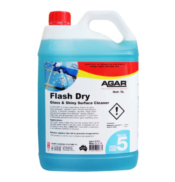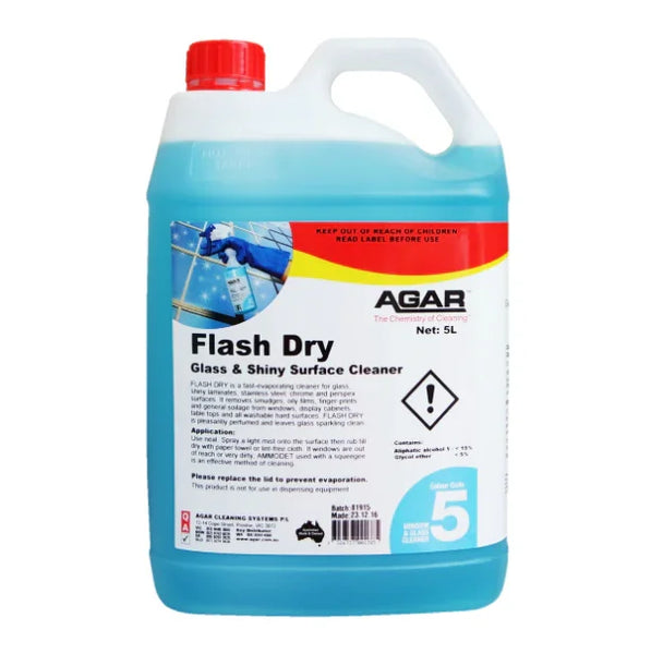What is AGAR Flash Dry 5L? Increase the power of your cleaning by using FLASH DRY. It's a high-performance window and glass cleaner that evaporates extremely fast. It efficiently removes dirt and grease from shiny surfaces. It eliminates 99.9 percent of germs and does not leave streaks,...